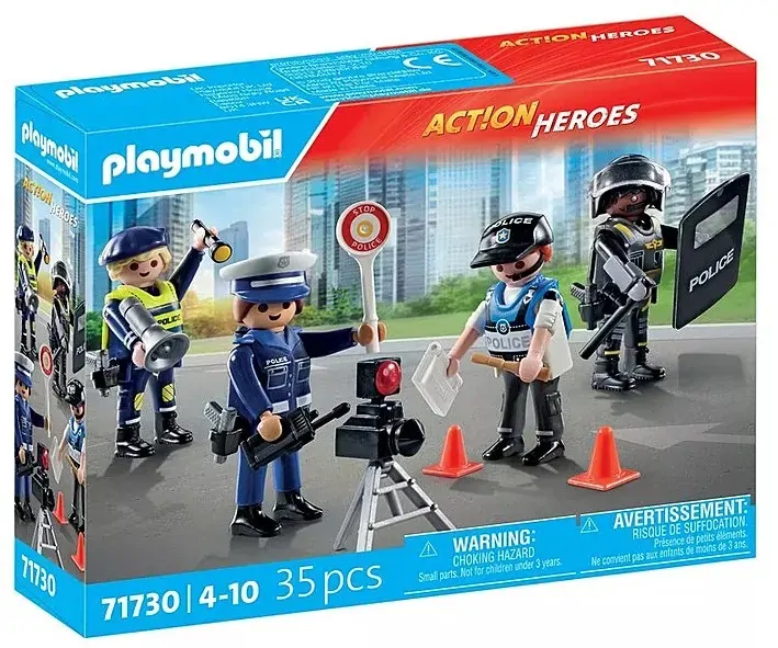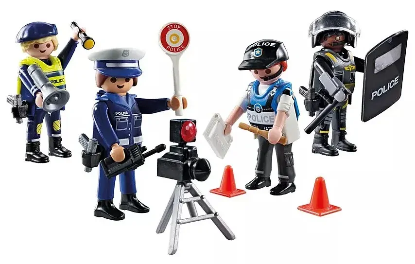 Set includes 1 man with police helmet, 2 men with police cap, 1 woman with police cap, 3 holsters with pistols, 1 police shield, 1 police multi-purpose baton, 1 SEK protective vest, 1 police trowel, 1 mobile radio telephone, 1 mobile radar flasher, 1 police vest, 1 paint box with brush, 1 flashlight, 1 megaphone.