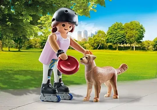 Get ready for a day of fun and movement with the PLAYMOBIL Inliner with Retriever! Watch as the athletic inline skater shows off her skills while her playful retriever eagerly fetches the frisbee. This dynamic duo is packed with realistic details—remove the skater’s inline skates, helmet, and wristwatch for even more imaginative play. The retriever’s poseable head lets it join the action, whether it's playing catch or happily trotting along on its lead and harness.