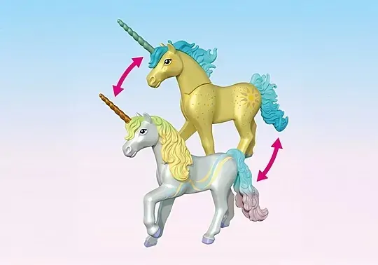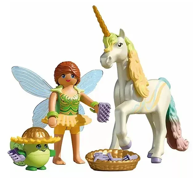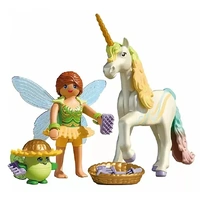 Meet the unicorn Rainbow Flower and her enchanting fairy friend! Rainbow Flower is known for her special connection to rainbowsher radiant presence brings color and hope to the Unicorn Kingdom. The enchanting fairy is accompanied by her adorable sidekick, the Joyling, who helps care for the unicorn with great joy and dedication. The unicorns mane, tail, and horn are interchangeable, allowing you to create unique and personalized unicorn designs when combined with other unicorns from the new PLAYMOBIL Unicorn series!