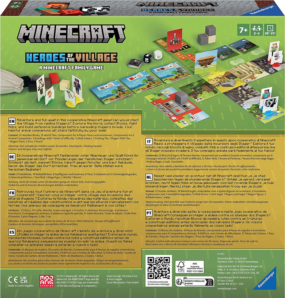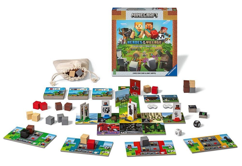 In Minecraft: Heroes of the Village, the players will work together to defend the village from an impending illager raid. On your turn you will have 2 actions to spend on exploring the world, collecting blocks, fighting mobs, and building. At the end of your turn, roll the die to see if the illagers advance towards the village. As the illagers get closer to the village, more monsters will spawn, but dont worry! You have your faithful pets to help. Each pet has a special ability that can help you succeed. If you manage to construct three buildings before the illagers reach the village, you win!