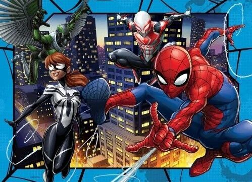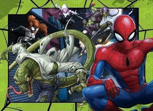 This bumper pack contains 4 puzzles of 100 pieces each, depicting the Amazing Spider-Man in a bunch of action-packed scenes alongside fellow superheroes and villains.