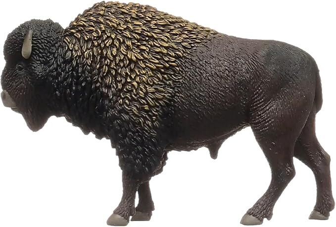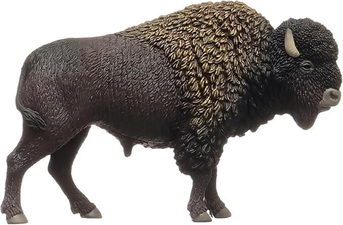 This bison looks magnificent with its mighty head and distinctive hump on its shoulders. The thick brown coat is lighter colored and denser on the back. Its thick head and broad chest are colored black. The bison does have two short horns on its head, just in case, but it actually looks very friendly.
