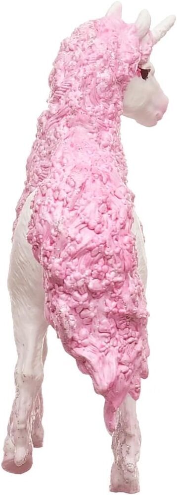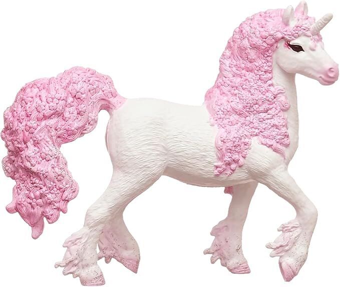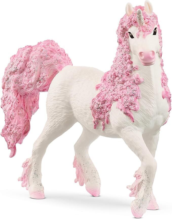 The flower unicorn mare looks simply enchanting with her lush mane of delicate, pink flowers. Even her thick tail is a mass of flowers. Her bright white coat shines like snow in the sun. A dazzling beauty!