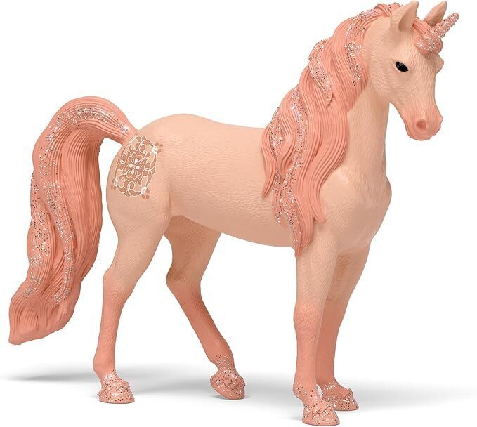 The Mandala Unicorn Mare is simply adorable with its delicate peach-coloured coat. The hooves sparkle in the sun and the mare has a sparkling horn on its forehead. The dense mane and tail also shine with all the glitter in it. She has a beautiful tattoo on her side. Lovely!