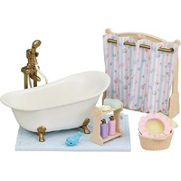 Furniture set with antique-style bath and shower fitting. Includes shampoo, soap, bath toy, shampoo hat, and other bath time accessories.