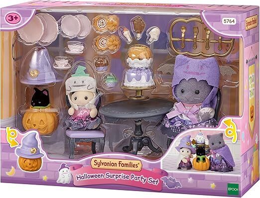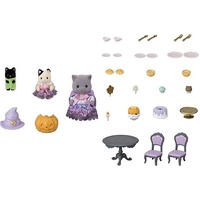This playset features a girl, baby and cradled baby with a table, chairs, sweets and accessories for a Halloween party. There are lots of fun features - cloaks that transform the characters into spooky Halloween creatures, a cake that changes its shape, a jack-o'-lantern to hide in, and more!