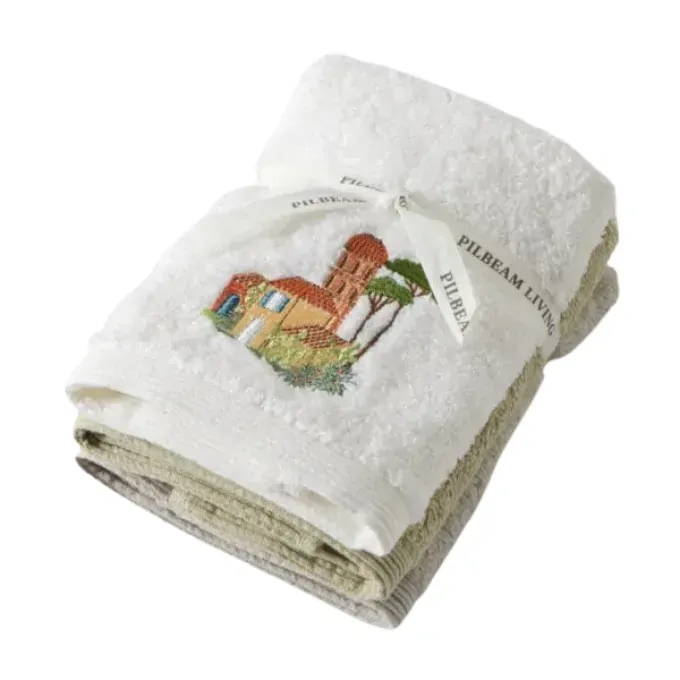Add a touch of charm to daily routines with the Pilbeam Living Valletta Face Washer Set. This beautifully presented set includes one embroidered design featuring a Mediterranean-style villa surrounded by greenery, complemented by two plain face washers in sage and grey. Made from soft, absorbent cotton and tied with a Pilbeam Living ribbon, this set makes a thoughtful gift and a stylish addition to any bathroom.