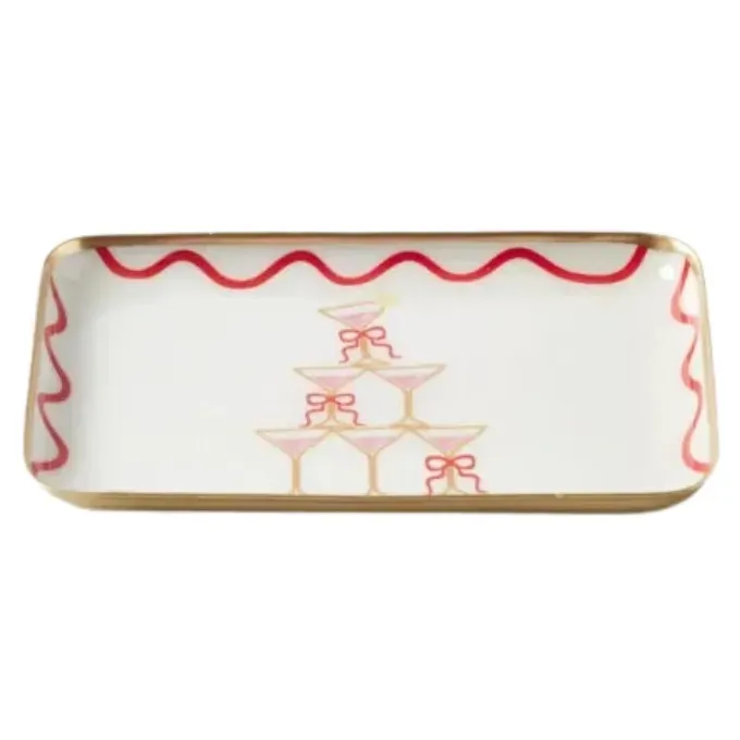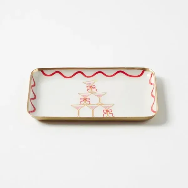 A fun piece for entertaining or gifting, the Celebrations Tray features a champagne tower topped with bows and ribbon detailing. Perfect for cockail lovers, it’s a great addition to bar cart displays or as a lighthearted gift. Crafted from iron with gold-toned edging.