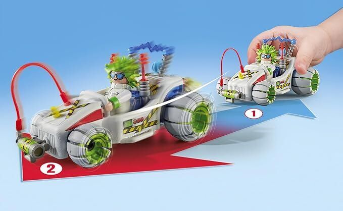 On your marks, get set... Without hesitation, the mad professor zooms off in his kart with a retractable motor. Boiling test tubes, electric contraptions, and a beam drive make his kart a scientific sensation that outshines everything else. Exciting races, navigating obstacles, or crazy stunts - the PLAYMOBIL Funstars are on the loose! This wild PLAYMOBIL car is perfect for fans of crazy rides. The futuristic new body can be adorned with various accessories. The vehicle accommodates a PLAYMOBIL figure. Thanks to the practical retractable motor, high-octane action in the playroom is guaranteed. A fantastic gift or souvenir for car-loving children aged 4 and up.