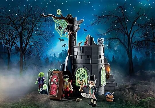 PLAYMOBIL Spooky Fun! Haunted Ruins with three PLAYMOBIL figures, a ruin, a coffin, bats, spiders, and many more extras for thrilling role-playing in the children's room.