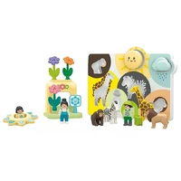 Set includes 1 woman, 1 man, 1 girl, 1 giraffe, 1 zebra, 1 lion, 1 monkey, 1 puzzle plate, 1 flower booth, 1 number spinner, 3 plug-in flowers, 1 sign, 1 cloud, 1 sun, 1 suitcase.