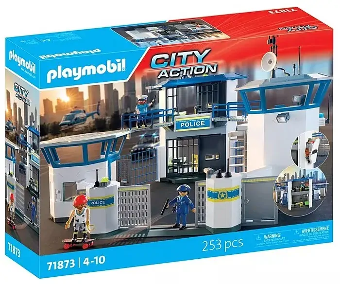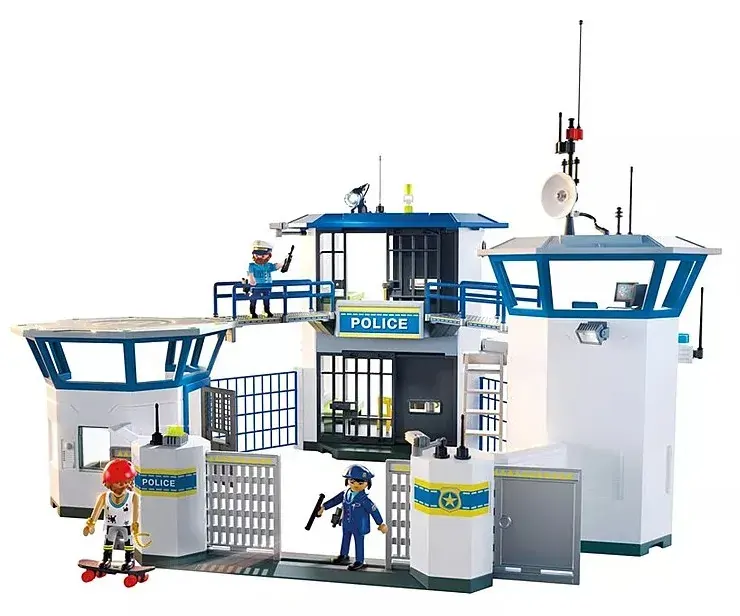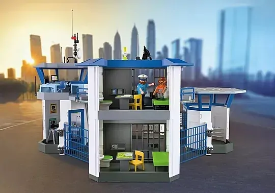 Set includes 1 policeman, 1 policewoman, 1 gangster, 1 police headquarters, 1 desk with PC and telephone system, 1 gun cabinet, 2 toilets with washbasin, 1 seat pan, 1 desk, 2 chairs, 2 wooden chairs, 2 pairs of handcuffs, 2 batons, 2 speed guns, 2 berets, 4 pistols, 2 toothbrushes, 2 toothbrush tubes, 2 cups, 2 spoons, 2 plates, 1 fingerprint scanner, 2 fingerprint foils, 1 bust, 1 convict uniform, 1 flash, 1 laptop, 1 dictaphone, 1 wristwatch, 1 necklace, 1 box, 2 cards, 1 skateboard, 1 radio, 4 locks, 1 skater helmet, 1 police cap, 1 cap.