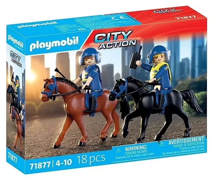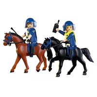 Clip-clop through the city with the PLAYMOBIL Police Squadron! Mounted on their trusty horses, the policewoman and policeman patrol the streets, ready for action with radio, flashlight, and removable vests. The horses are fully equipped with saddles and halters, and the officers wear helmets with visors that flip up for quick commands. Whether directing crowds or racing through narrow alleyways, this PLAYMOBIL playset brings exciting law-enforcement adventures to life. Perfect for little riders and mini officers who love to keep the peace!