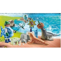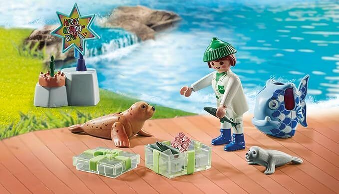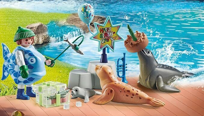Creativity, fun, and joy await with the PLAYMOBIL Keeper with Animals Gift Set! This enchanting set is not just a toy; it's a party in a box. It comes already packaged in a decorative box that even has space for the birthday child's name. Say goodbye to the hassle of wrapping – this gift set is already perfectly presented. Dive into the world of underwater birthdays with the adorable seals. In this unique set, the seals celebrate their birthday, and their dedicated animal caretaker is dressed as a fish, equipped with a trumpet for a grand entrance. Using a fishing rod, she feeds the seals a feast of fish stored in a cooler with ice cubes and a giant salmon. But that's not all! The star of the show is the impressive sea lion, who, with the help of a special adapter, can balance a birthday cake on its nose. Both the sea lion and the seal have movable heads and flippers, adding to the realism of the play.