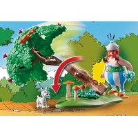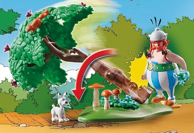 Set includes 1 Asterix figure, 1 Obelix figure, 1 Dogmatix, 1 wild boar, 2 squirrels, 1 base plate with tilting tree, flowers and mushrooms, 1 sword, 1 drinking bottle