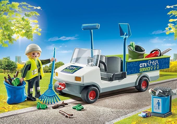 Set includes 1 woman figure, 1 electric car, 1 rake, 1 shovel, 1 bucket, 1 trash can, 1 broom, 1 garbage bag, 4 leaves, 4 branches, 1 cap,