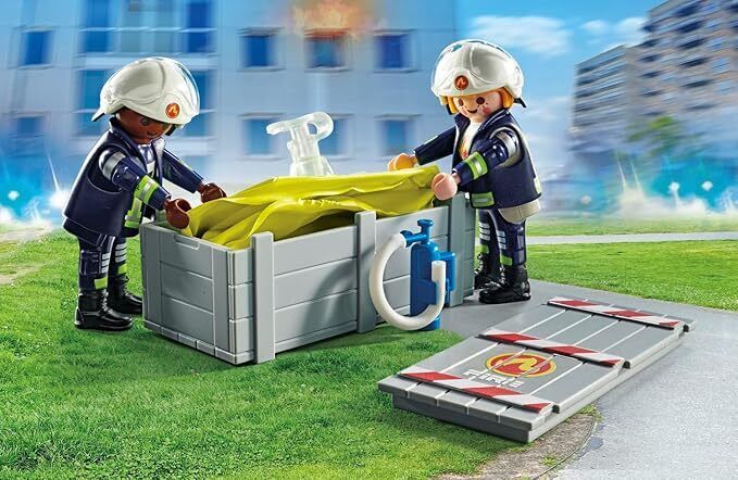 Set includes 2 men figures, 1 woman figure, 2 helmets, 1 air cushion, 1 box, 1 megaphone, 1 fire extinguisher