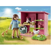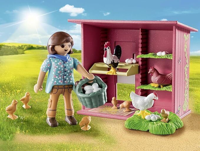 Set includes 1 woman figure, 2 chickens, 1 rooster, 6 chicks, 4 eggs, 2 grass floor, 1 chicken house