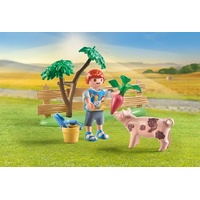 Introducing the PLAYMOBIL Country Vegetable Garden with Grandparents! Spark your child's imagination with this delightful toy set, designed for children aged 4 years and up. The set features grandparents and a grandchild, along with a piglet and a puppy. Made of over 80% sustainable material, it encourages eco-consciousness. Watch as the flowers "grow" when the bed is filled with water, plant new seedlings on the planting table, and cultivate mushrooms in the wooden box. Role-play has never been more rewarding!