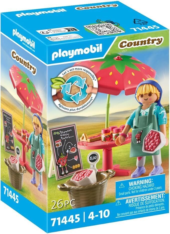 Indulge in the delightful world of the PLAYMOBIL Country Homemade Strawberry Jam Stall – where role-play is a piece of cake! Designed for children aged 4 years and up, this berry-luscious set is made from over 80% sustainable material, putting the planet first. Visit the strawberry stand and taste the sweetness of fresh-picked strawberries. Don't miss out on the scrumptious strawberry cake and tangy strawberry jam. With one PLAYMOBIL figure and a handle-equipped bag filled with fresh strawberry inserts, it's time to jam and have a fruitful playtime adventure!