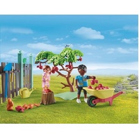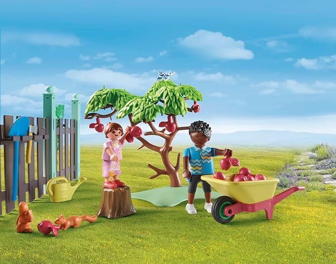 A detailed toyset with two PLAYMOBIL figures, a rooster and three hens, a squirrel, a chicken coop, an apple tree, and many garden tools for fun role-playing adventures. The apples can be harvested from the tree. All sets in the PLAYMOBIL Tiny House play world consist of more than 80% recycled and bio-based materials.