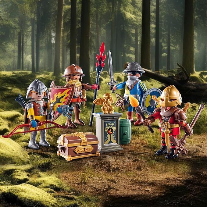 Experience magical playtime with the exciting knight playsets from PLAYMOBIL. With the versatile My Figures Sets, children can create a PLAYMOBIL world according to their wishes. Thanks to the figures in individual parts, creativity knows no bounds. Bodies, heads, arms, and legs can be assembled in any way desired, providing endless possibilities for imaginative play. Fun knightly play for children aged 4 and up. The play figure set includes four PLAYMOBIL figures, knight helmets, shields, swords, lance, a chest, a golden dragon statue, and many other fantastic extras.