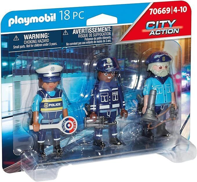 Protect and serve the community with the Police Figure Set. The officers are ready to help with any situation, whether assisting in the pursuit of a criminal or directing traffic in an emergency. Play with this set on it's own or use it to add police reinforcements to the other sets in the PLAYMOBIL Police theme. Set includes three police figures, megaphone, walkie talkie, binoculars, hats, and other accessories.