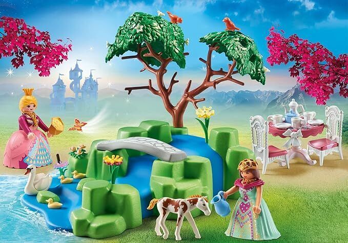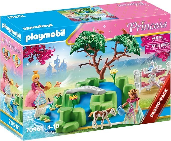 With the PLAYMOBIL Princesses' Picnic Promo Pack, you're off on a fairytale play adventure. Together with their cute foal, the two princesses enjoy a wonderful day at the pond. After a long walk, the friends enjoy their tea and watch the beautiful swan circling on the water. Enchanting fun for fairy tale fans aged 4 and up. Product details: The toy set includes two PLAYMOBIL figures, a pond with bridge, a foal, a swan, two chairs, a table and many other charming extras for imaginative role play in the children's room. The skirts, crown and hairnet are removable. The figures can, without skirts, sit on the chairs and take cup and jug in hand. The Princesses Promo Pack can be played with on its own or combined with other playsets from the PLAYMOBIL Princess series.