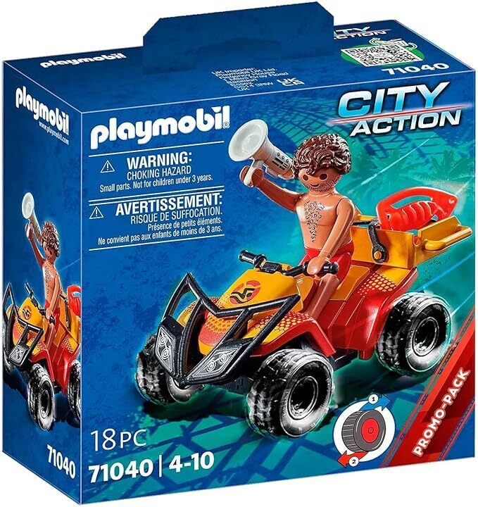 Get ready for exciting adventures on the coast with the PLAYMOBIL Beach Patrol Quad! Whether on the beach or in the water, the lifeguard always has everything in view to be on the spot quickly in an emergency. With his maneuverable quad with the thick tires, he drives up and down the beach and attentively watches swimmers and bathers. With its practical pull-back motor, the Beach Patrol Quad ensures action-packed rescue operations in the children's room. A great gift for birthdays, Christmas or other occasions for kids aged 4 and up. Specifications: The 18-piece play figure set includes a PLAYMOBIL figure, a quad with pullback motor, suntan lotion, megaphone and swimming board. Life buoy and megaphone can be stowed on the carrier and fixed with the silicone straps. Play with this set on its own or combine it with the other playsets in the PLAYMOBIL City Action series.