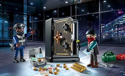 Set includes 1 villain figure, 1 police figure, 1 safe, 1 crowbar, 1 torch, 2 packs of dynamite, 1 policeman waistcoat, 1 police holster, 1 police pistol, 1 police cap, 1 pair of handcuffs, 1 gold bar, 5 bank notes