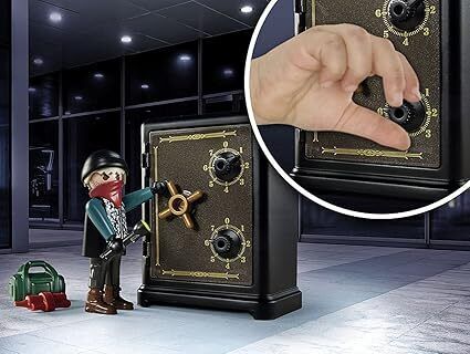 Once again, a thief is tampering with the safe this time, he's using a crowbar and dynamite to try and break it open and get his hands on the gold bars. But not while the PLAYMOBIL police officer from the PLAYMOBIL Starter Pack Bank Robbery is on duty seconds after the alarm goes off, he's already on the scene. Will he manage to catch the thief and take him away in handcuffs?