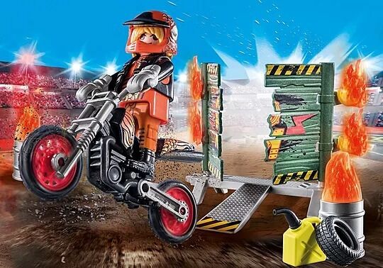 Practice daring tricks and great stunts with the Stunt Show Starter Pack from PLAYMOBIL. This stuntman fears nothing and even drives his cool motorcycle through the burning wall of fire. For protection he wears gloves and helmet. Stay tuned to see the next stunt. An exciting playset for stunt fans aged 4 and up. The toy set comes with a PLAYMOBIL figure, a motorcycle, gloves, canisters, tires, a fire wall with ramp and other accessories for exciting role play in the children's room. PLAYMOBIL Starter Packs take you right into the middle of the colorful PLAYMOBIL universe. The sets contain play figures and accessories for popular PLAYMOBIL worlds, are quick to assemble and ready to play straight away.