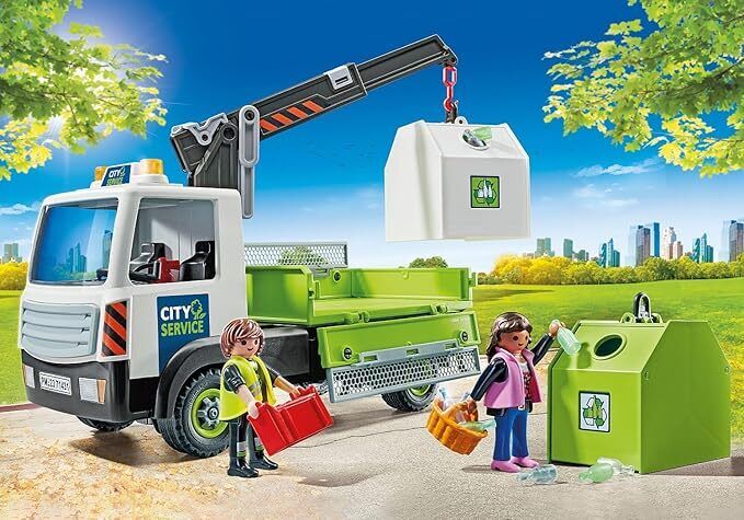 The playset includes two PLAYMOBIL figures, a glass recycling truck with container and flexible crane, two containers, bottles and other extras for entertaining role playing adventures in the children's room. To insert the figures, the roof of the truck can be removed.