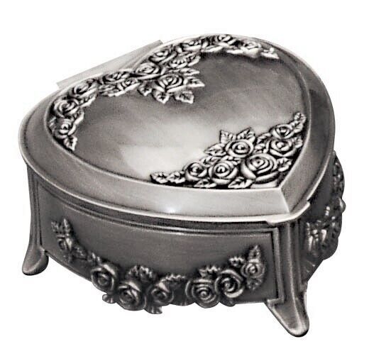 A pewter finish footed heart-shaped box with an intricately carved roses motif, perfect for storing jewellery or trinkets.
