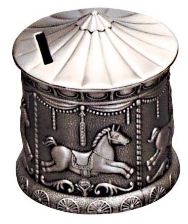 A pewter finish money box in the shape of an intricately detailed merry-go-round with horses.