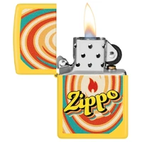 Surrounded by a hypnotic spiral, the Zippo flame icon and wordmark stand out on this classic Sunflower lighter in a mesmerising Colour Image design.