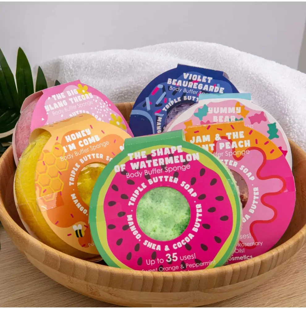 1. Place your luxury Body Buffer Soap Sponge under your shower to activate the soap and butters.