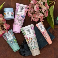 - Rhubarb scented bath and body care set for post-gardening recovery, including hand cream, barrier cream, lip balm, foot cream, and bath salts.