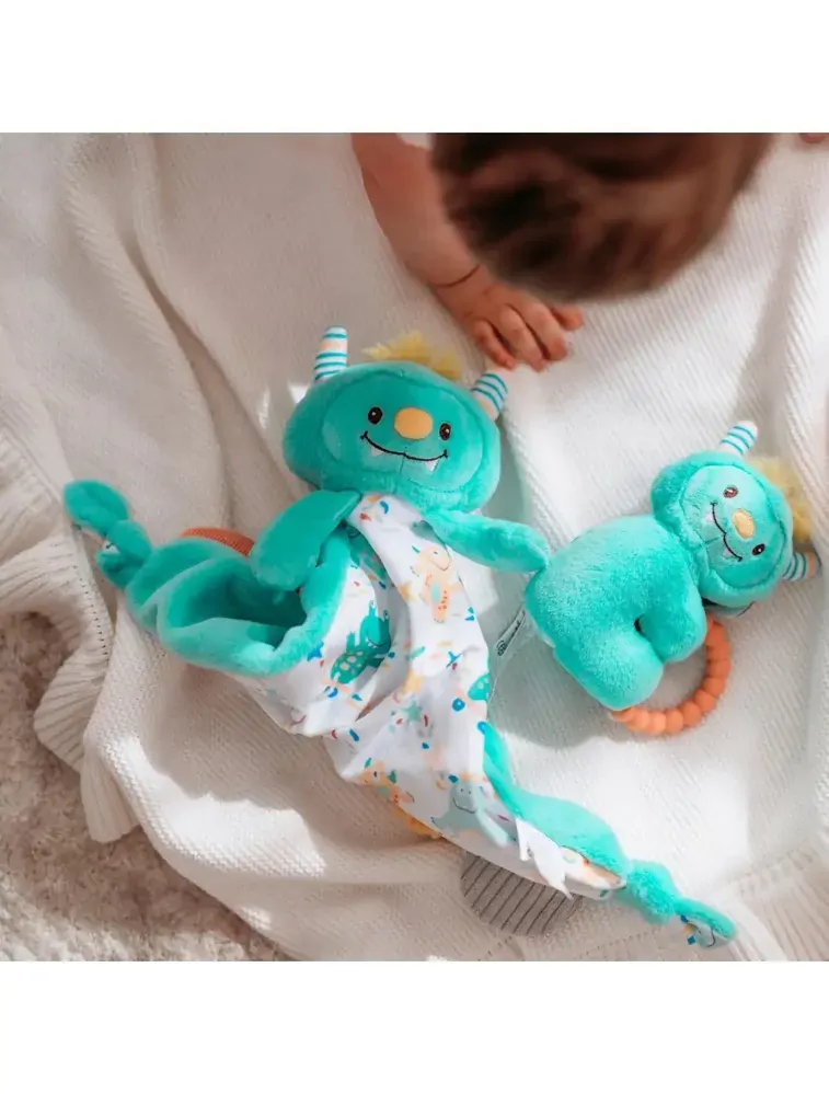 Mookie is one cute monster! Mary Meyer's lovable little monster features a big grin, bright yellow details, a couple of teeth, and striped horns that add a playful touch. Perfect for engaging and delighting your little one, this cuddly creature is sure to become a favourite for babies and parents alike. The aqua-colored monster is made with super-soft fabrics, ready to bring joy and fun to your baby’s playtimes and bedtimes.