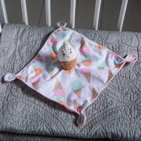 - Soft, stuffed plush ice cream sits atop the center of the blanket