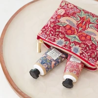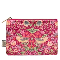 - Raspberry velvet cosmetic bag featuring the iconic Strawberry Thief print, filled with hand care essentials.