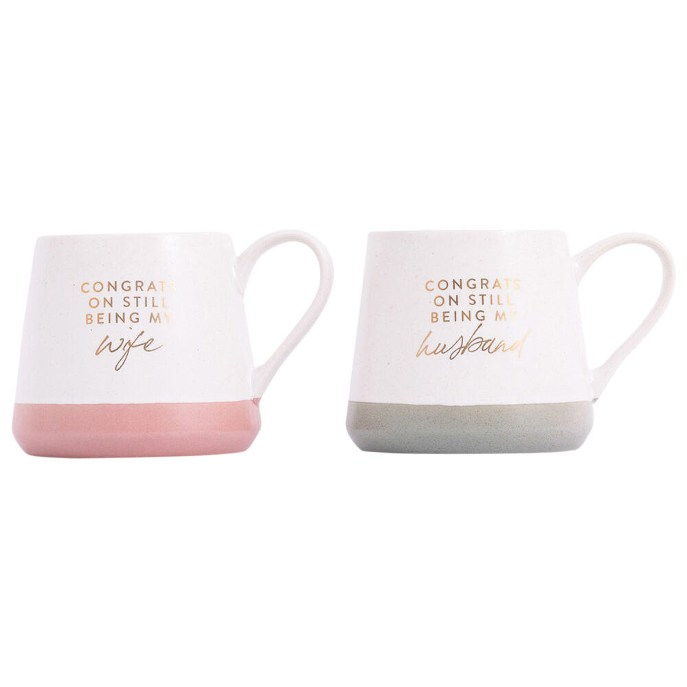 Mug 1 reads "Congrats on still being my wife". Mug 2 reads "Congrats on still being my husband".