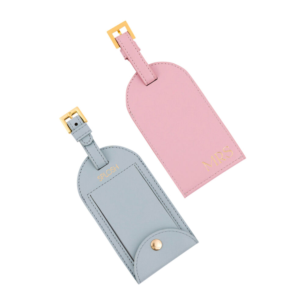 Matching pink and blue luggage tag set complete with embossed words on each saying "Mr" and "Mrs".