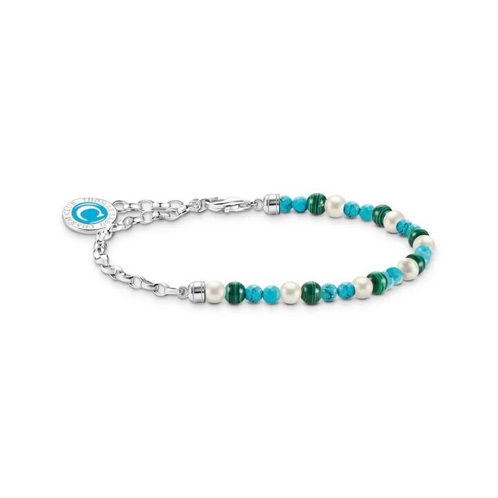 Charm holder: Link bracelet with pearls and malachite beads. Fascinating look thanks to the combination of an anchor chain style link bracelet with a pearl, turquoise and malachite beaded bracelet. Elaborately designed end caps with engraved lines. Round THOMAS SABO Charm Club Charmista coin with blue cold enamel. Can be combined with different charm pendants. Available in different lengths.