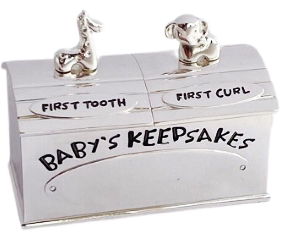 A silver-plated keepsake box for baby's first tooth and curl. There are separately labelled compartments, with an elephant and a giraffe atop each one. The front of the box reads 'Baby's Keepsakes'.