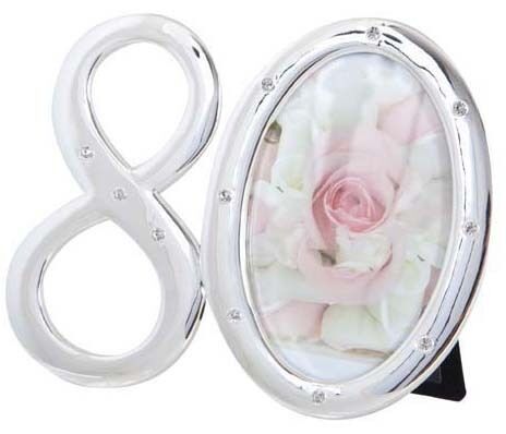 A silver-coloured photo frame in the shape of the number 80 with space for a round photo in the 0. Diamantes decorate both numbers.