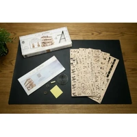 The DIY model bus is rated "medium" difficulty, has 268 pieces and an estimated assembly time of 6 hours. To assemble, just punch the pieces out of the laser pre-cut boards and snap them together. No glue or special tools required. Don't forget to sand and wax the moving parts to make your Knight Bus™ run smoothly (sandpaper and wax included in the kit).