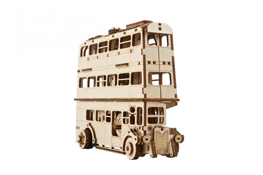 Assemble me. Punch your ticket for an exciting adventure! This DIY wooden mechanical model bus is an exciting addition to the Ugears Harry Potter™ collection, and a very clever piece of engineering indeed. To set the bus in motion, press down the magical manipulator button while holding the bus, then let go! The Knight Bus™ roars off thanks to a system of gears that transfer energy from the spring to the wheels, including a “flip” gear that lets the bus continue coasting.