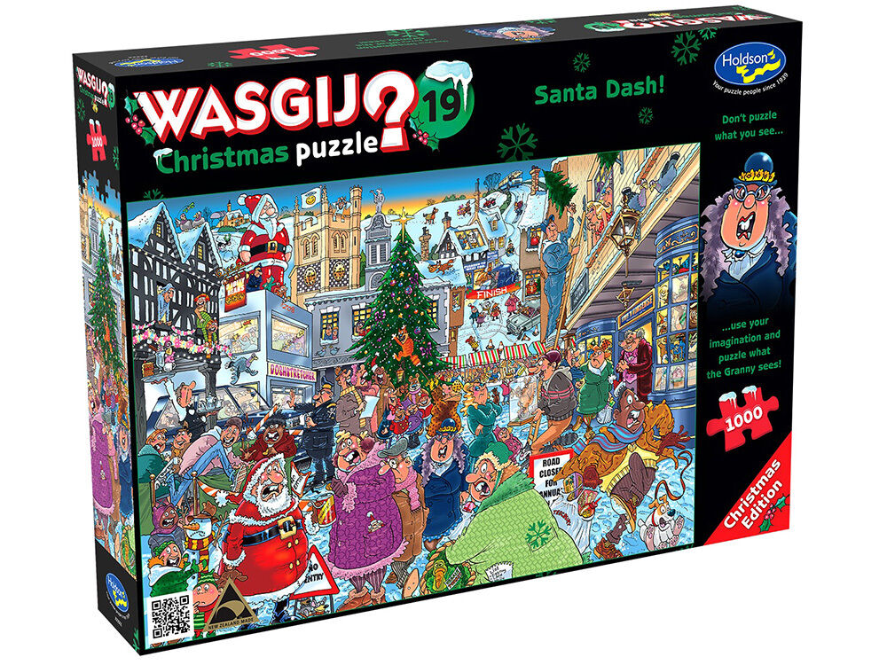 Santa's Dash!' is the title of this festive Wasgij Xmas 19 1000-piece jigsaw puzzle. Christmas is approaching and the Upper Pigglington town square is bustling with shoppers picking up their last-minute gifts and enjoying the festivities. Some of the crowd can't believe what they are seeing, but should they have been checking the signs instead of their shopping lists? What could Granny have spotted that has stunned the shoppers? That is the image you need to puzzle.