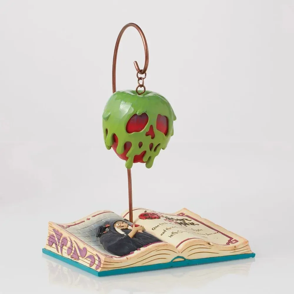 This Jim Shore design features the spell book from Snow White lying open, revealing a page describing the Poison Apple, with an image of the Wicked Witch accompanying the text. Suspended from a wire extending out from the book is the apple itself!